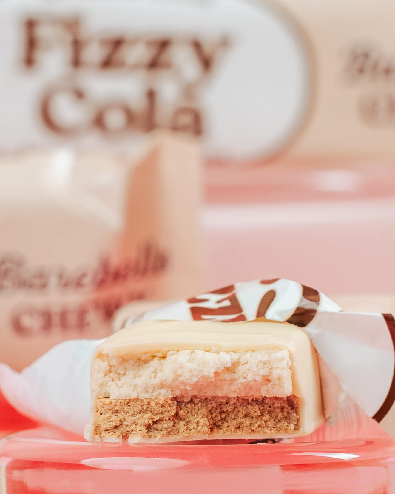 Fizzy Cola is a fluffy, snack-sized dream without added sugar. It is a multi-layered chewy treat with a refreshing cola flavor and a thin white chocolate cover. The taste is reminiscent of soda, but way more fun to chew.  Each bar contains 10 grams of protein.